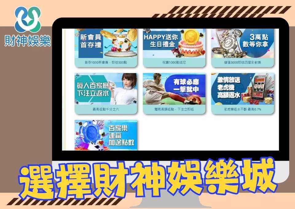 - ∙ 優惠和獎勵:財神娛樂城對新手和老玩家都非常大方,提供各種吸引人的註冊獎勵、存款獎勵和忠誠獎勵,讓你的每一分投資都有更多的回報。